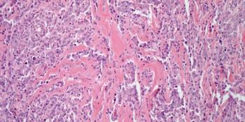 A 43-year-old man presents with a cough and chest pain. Imaging shows a mass in the lower lobe of his right lung, and a biopsy is performed. What is your diagnosis?