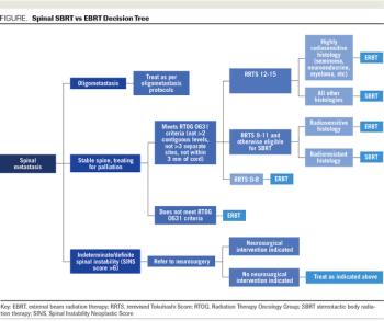 ABSTRACT Symptomatic spinal metastasis is a frequent complication of cancer that had been treated, until relatively recently, with primitive techniques to modest radiation dose levels, with a baseline assumption of limited survival and poor patient performance in that setting. In the era of targeted and personalized therapies, many patients are living longer and more functionally and are able to manage their disease on the model of chronic illness. Given these developments, an attractive option is the use of stereotactic body radiation therapy (SBRT) to deliver high biologically effective doses of radiation conformally to maximize the palliative gains of treatment. However, randomized data to guide practice are scarce. We review the extant literature and present an algorithmic approach to selecting patients with metastatic disease for palliative spinal SBRT favoring the results of available randomized studies and remaining within the safety constraints supported by evidence from randomized trials.