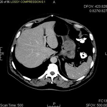 The patient is an otherwise healthy 45-year-old female who presented to her primary care physician with 6 weeks of increasing left upper quadrant abdominal pain with radiation to the back. She underwent an abdominal ultrasound, which revealed a large cystic abdominal mass.