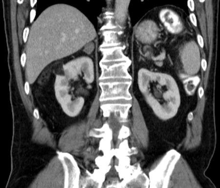 Case History: 60-year-old man with mild right side abdominal discomfort and hepatomegaly found to have large right renal mass during CT scan.