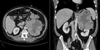 A 56-year-old woman presents with abdominal fullness and virilization. Axial and coronal images from a CT scan of her abdomen are shown below. What is your diagnosis?